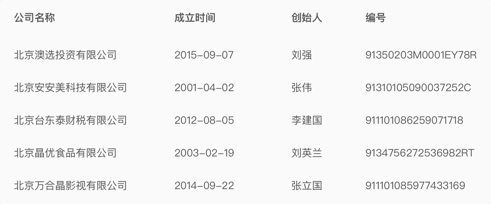 | 公司名稱 | 成立時間 | 創(chuàng)始人 | 編號 |